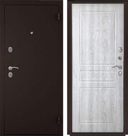 Входная дверь покрыта износостойкой полимерно-порошковой краской имеет два контура уплотнения, которые обеспечивает защиту от сквозняков и шума. Внутренняя сторона двери выполнена в виде МДФ панели