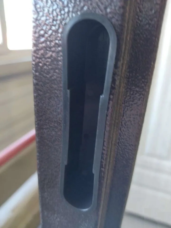 Дверь комплектуется цилиндровым замком Просам 3B4-31/55 второго класса, дверным глазком круглой формы. Дверная ручка установлена на планке совместно с замком и окрашена в медный цвет.